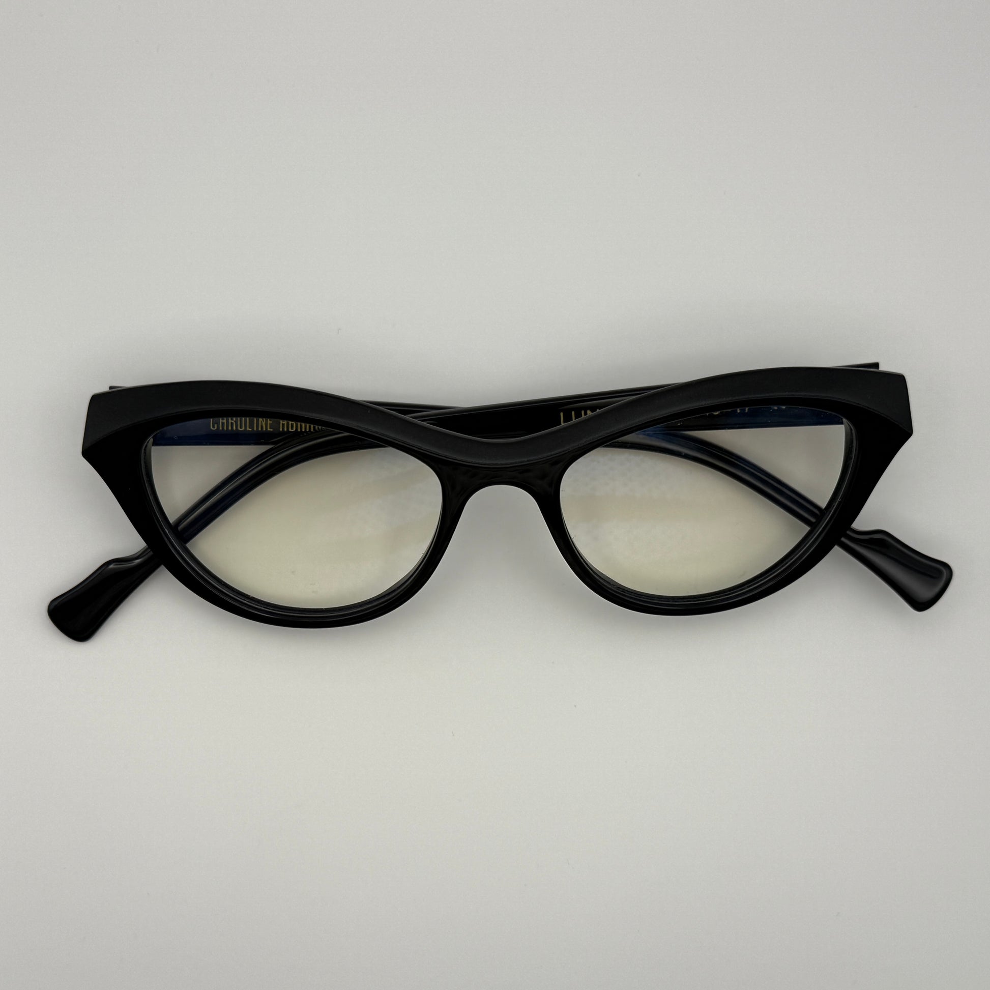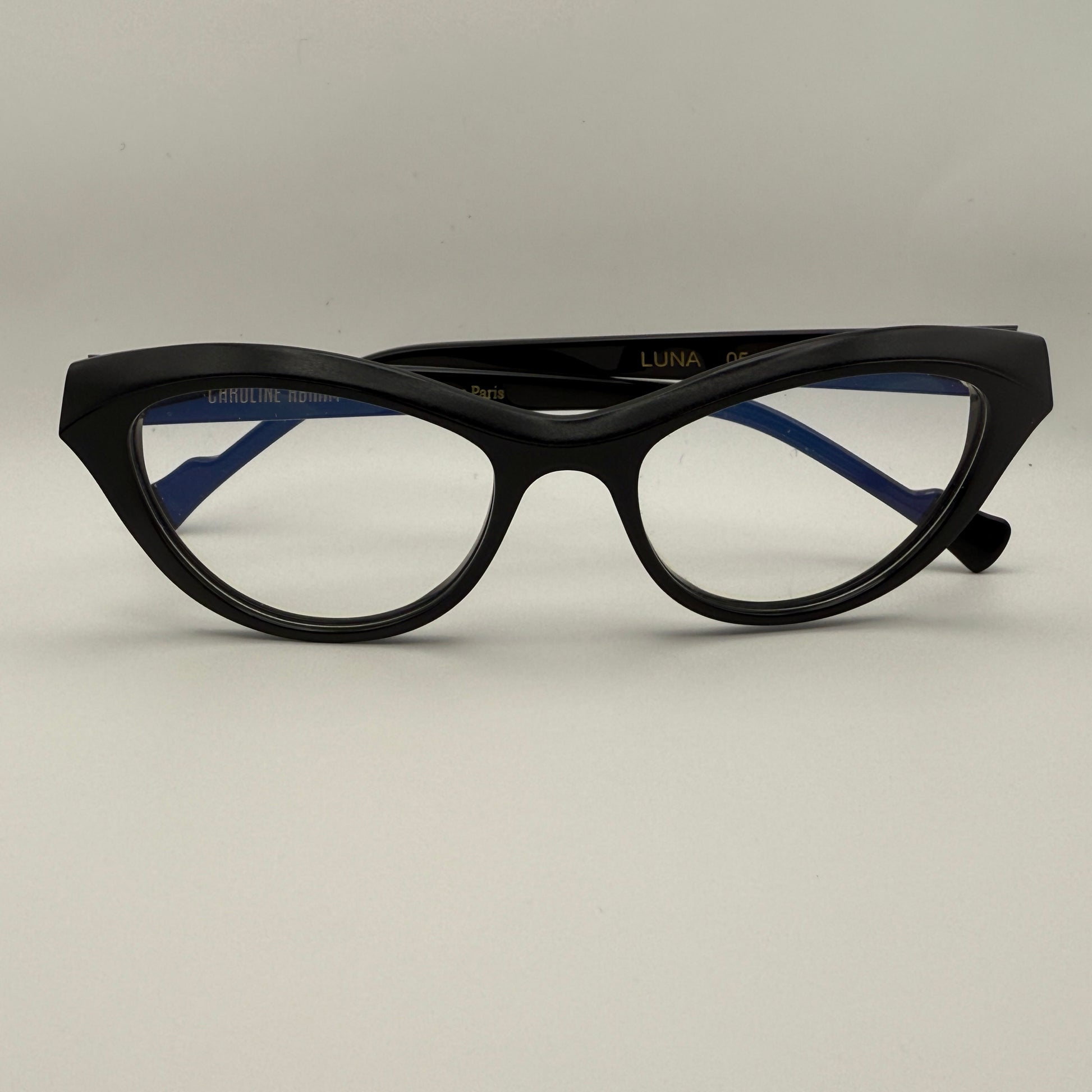 Occhiale da vista Caroline Abram Luna, con un design cat-eye elegante e sofisticato. La montatura è realizzata in acetato con finiture miste lucide/opache per dare profondità e contrasto. Le aste, decorate con elementi distintivi del brand, completano lo stile raffinato e femminile tipico di Caroline Abram.