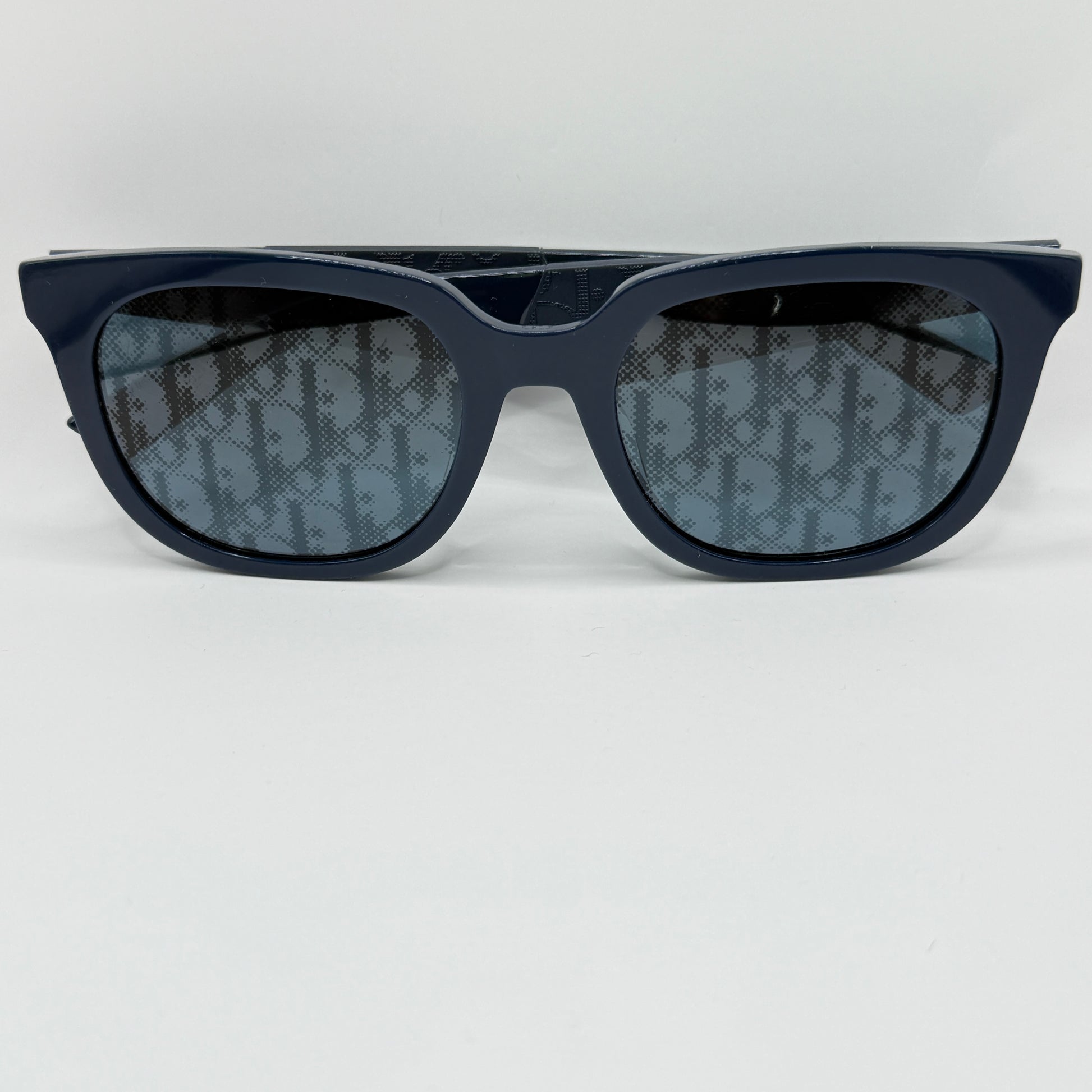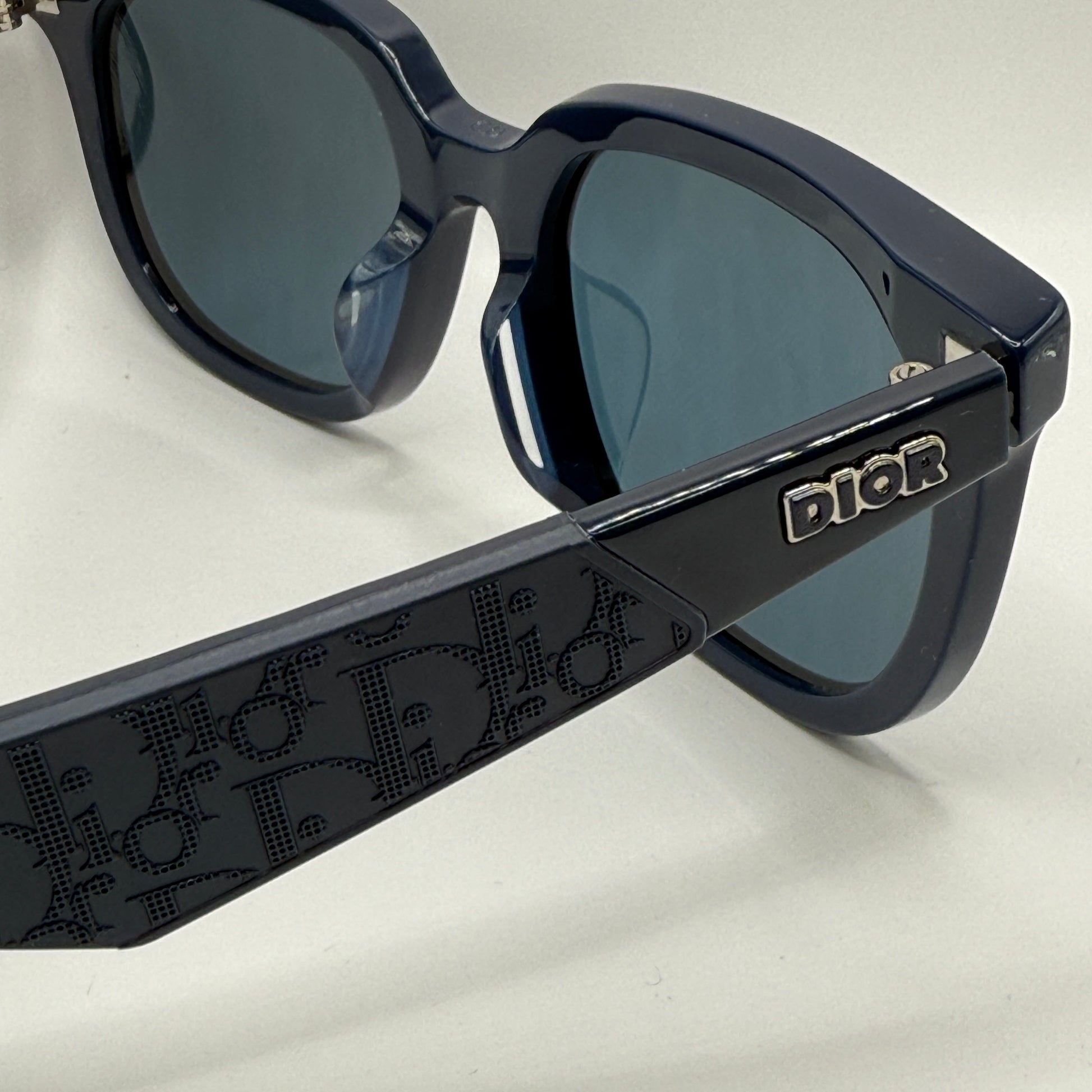 La montatura in acetato blu intenso presenta aste scolpite con una raffinata ricopertura in stampa 3D che riproduce il celebre motivo Dior Oblique, creando un effetto tattile e tridimensionale unico.