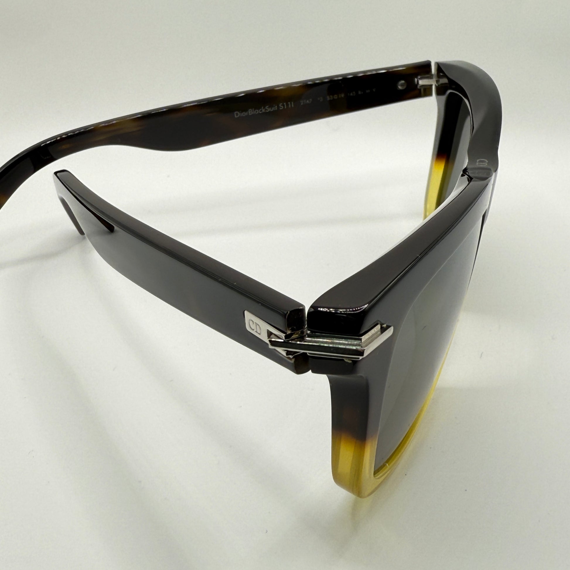 Il modello Dior BlackSuit S11I esprime un’eleganza maschile decisa e contemporanea. La montatura in acetato bicolore, che sfuma dall’Havana scuro al giallo miele, dona profondità e carattere a un design dalle linee nette e maschili. Il frontale rettangolare è impreziosito da un dettaglio in metallo argentato sul musetto, con l’iconica incisione “CD”, che richiama il mondo sartoriale della collezione Dior BlackSuit. Le lenti uniformi grigio-verdi completano il look con sobrietà e stile. Un occhiale dall’identità forte, perfetto per chi ama un’eleganza sofisticata ma contemporanea.