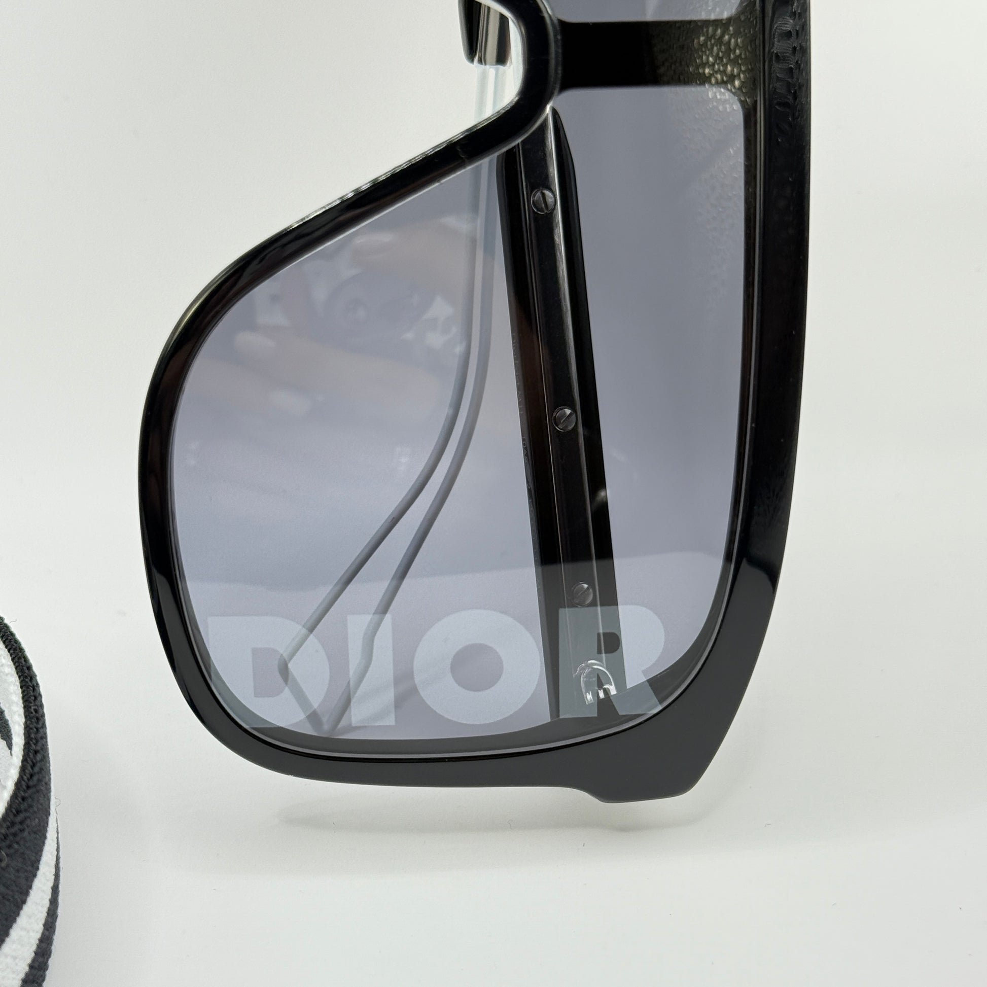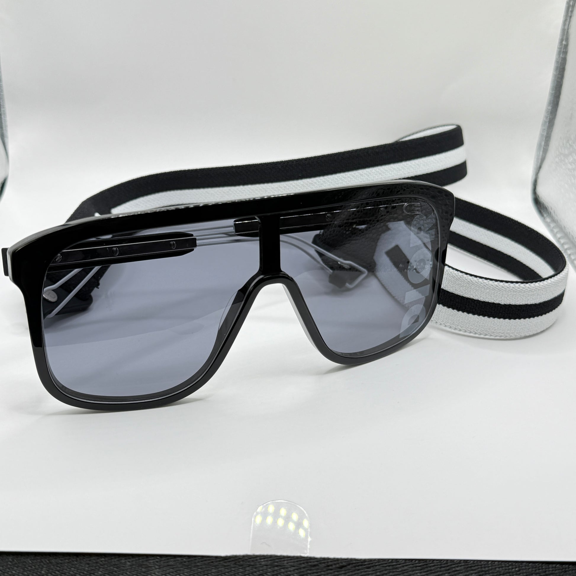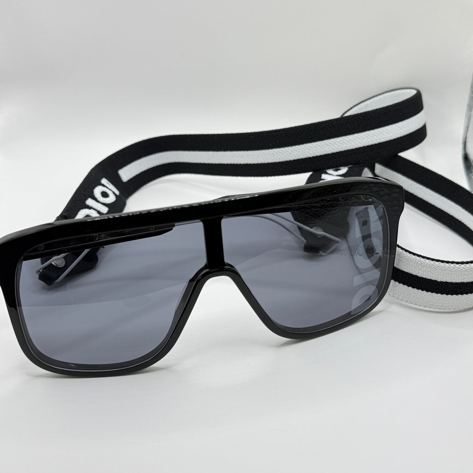 Logo Dior sulla lente, fascia elastica rimovibile bianca e nera logata |
