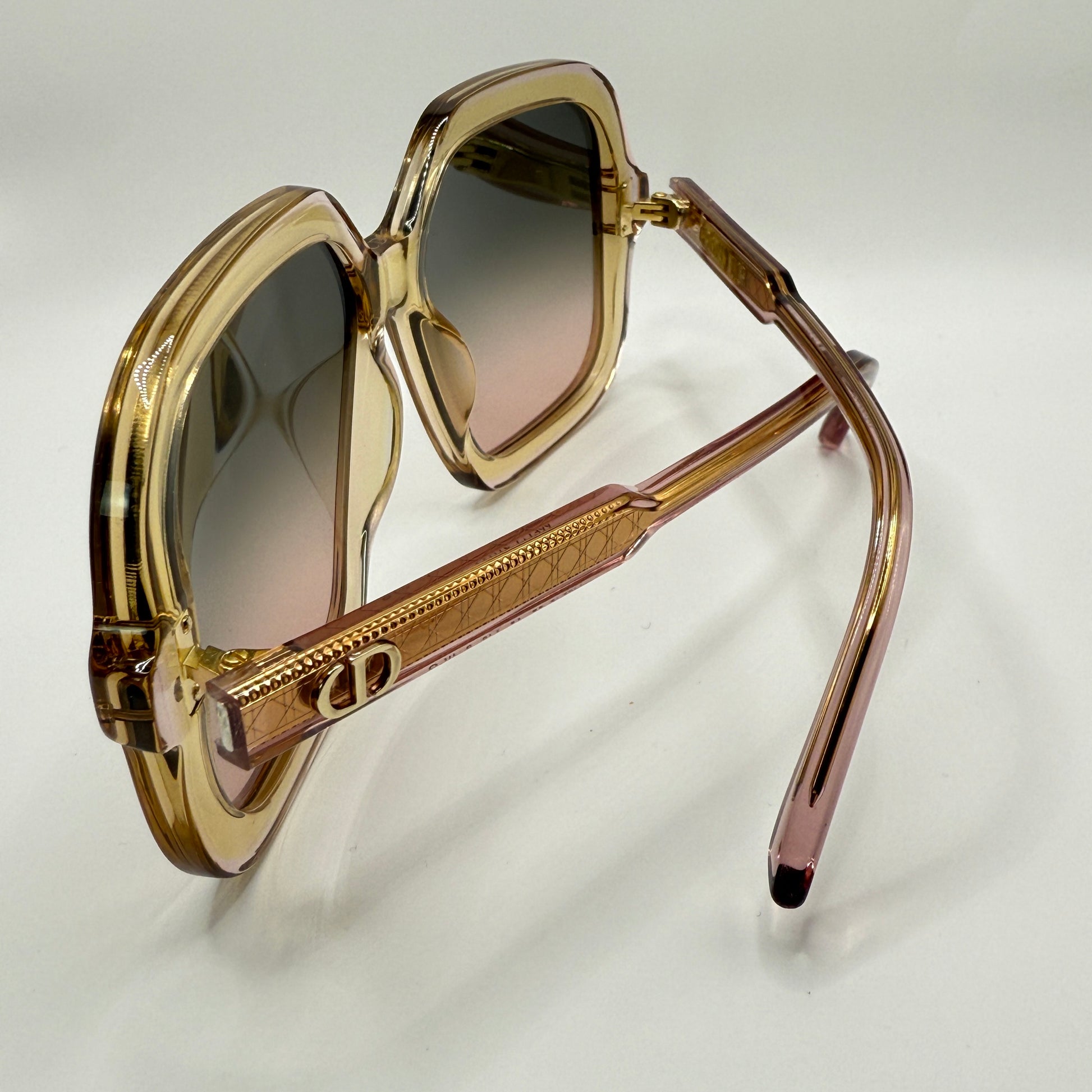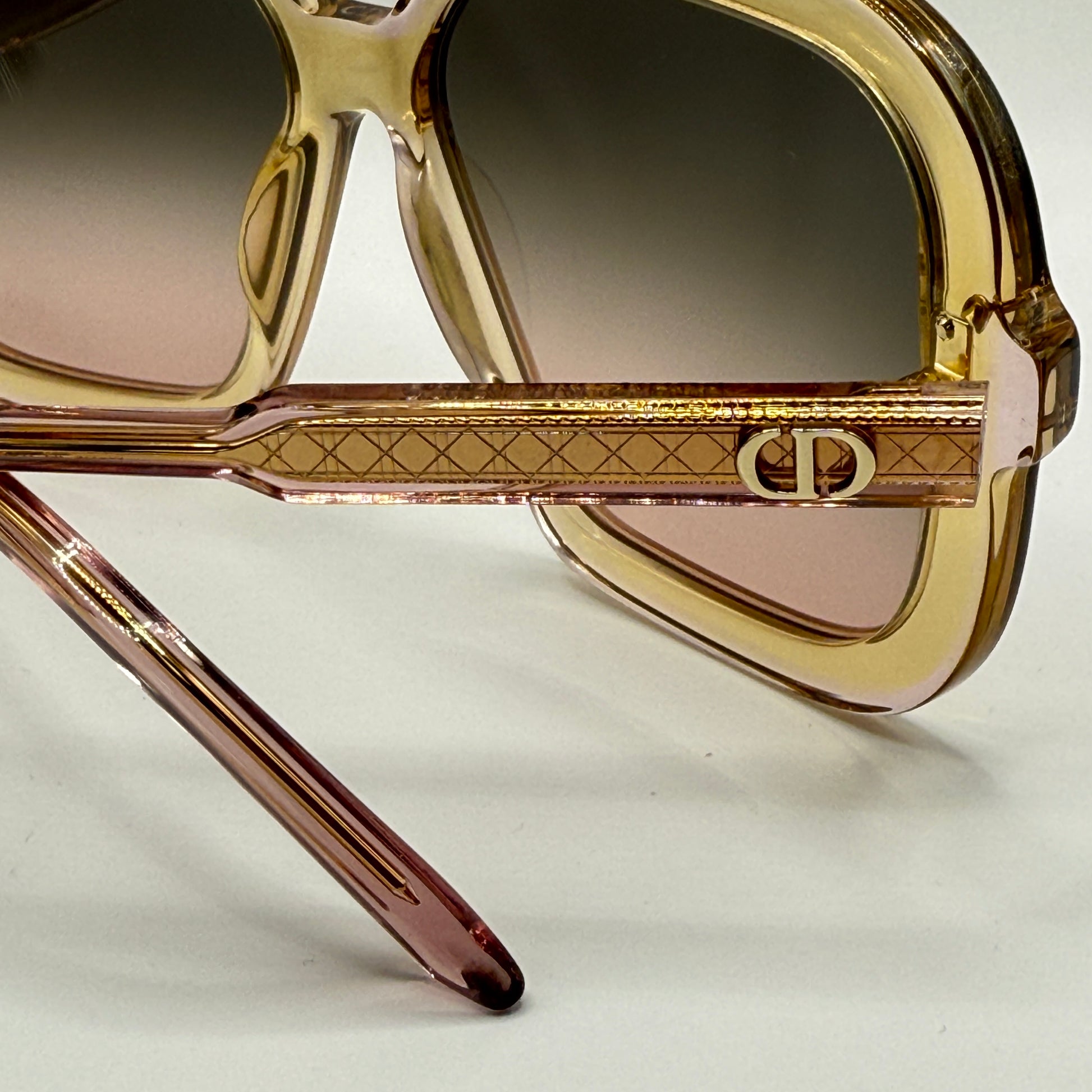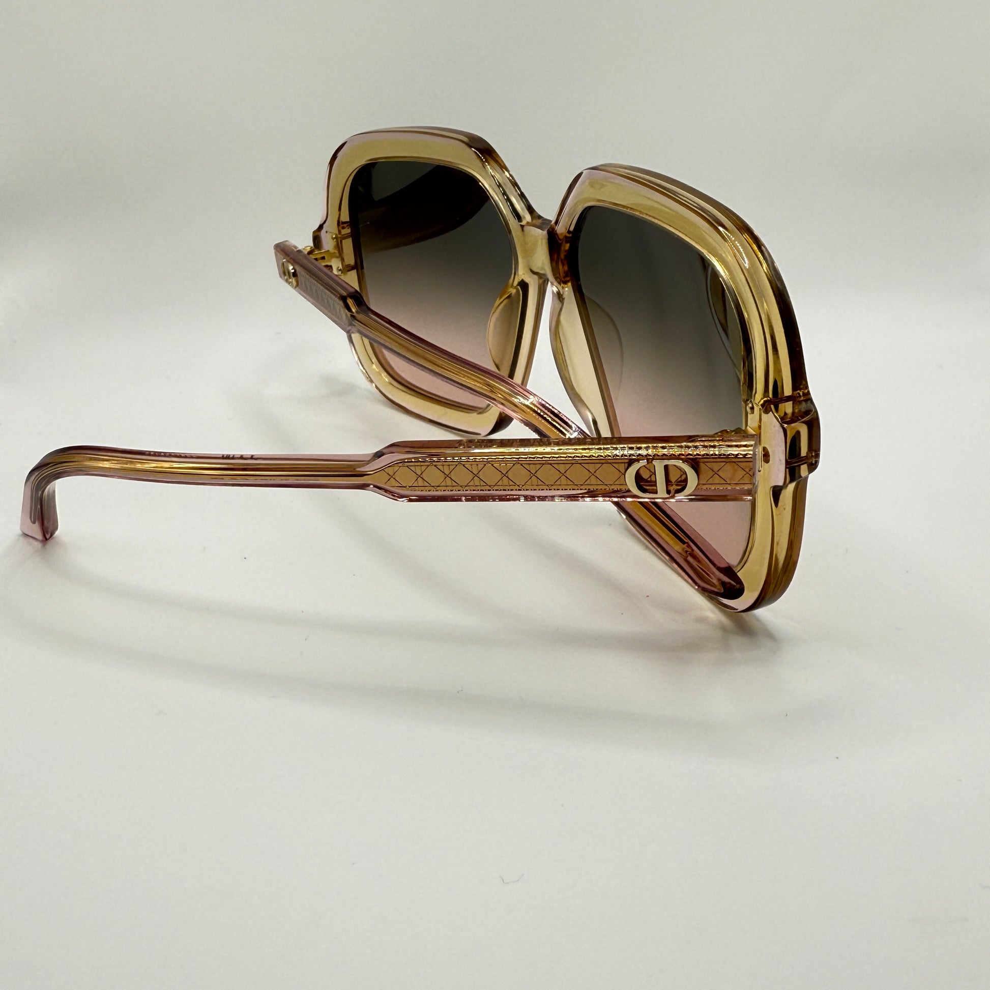 Sulle aste, il logo CD dorato firma con discrezione l’occhiale, mentre le lenti sfumate grigio-rosa aggiungono profondità e comfort visivo con protezione UV totale.