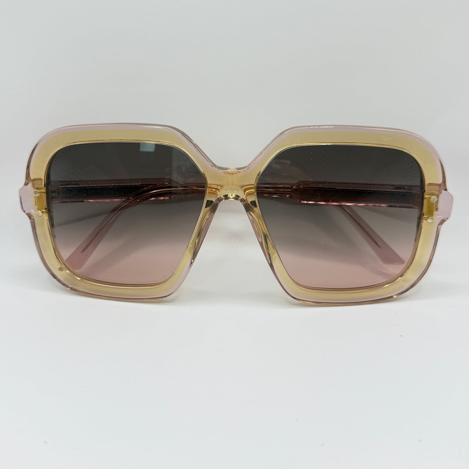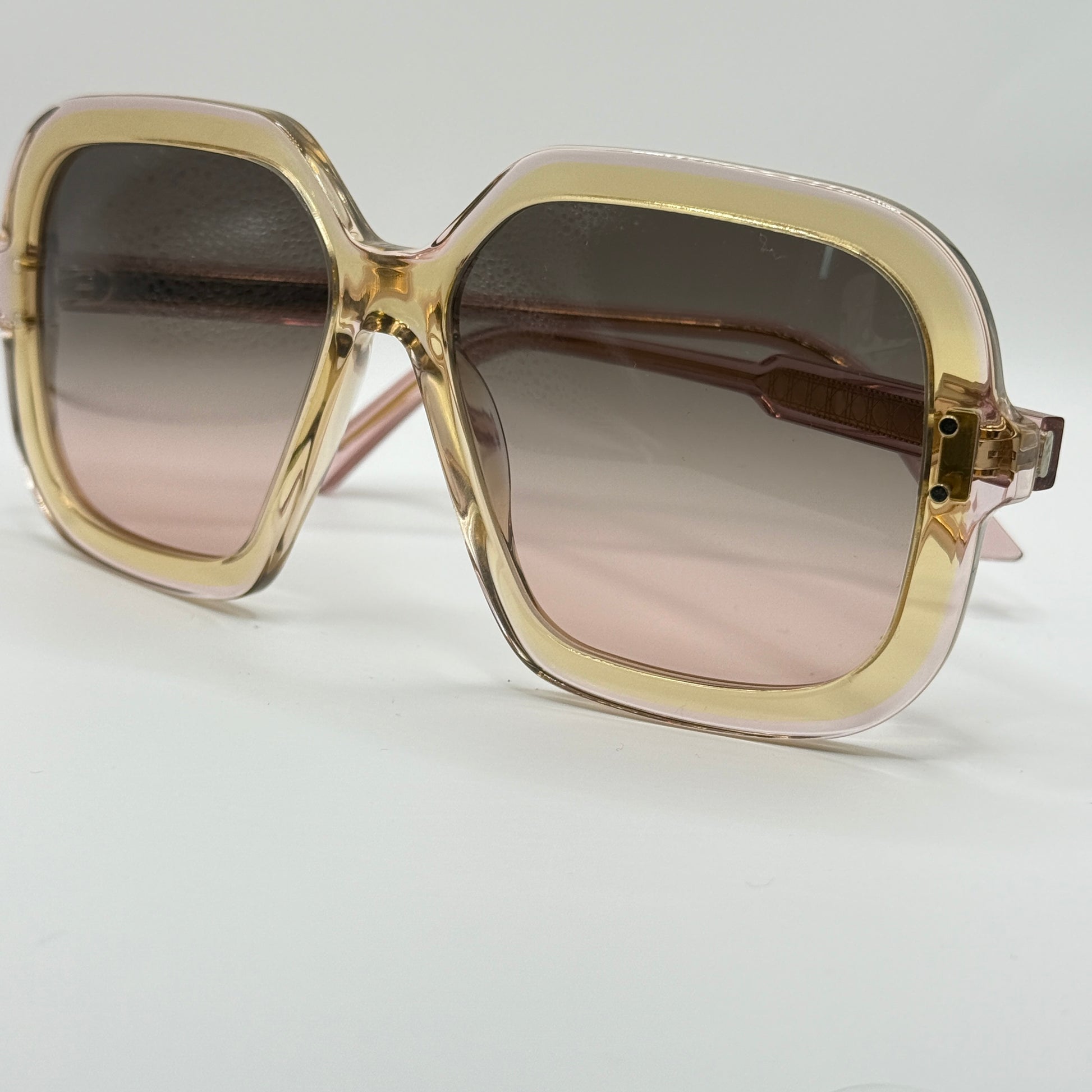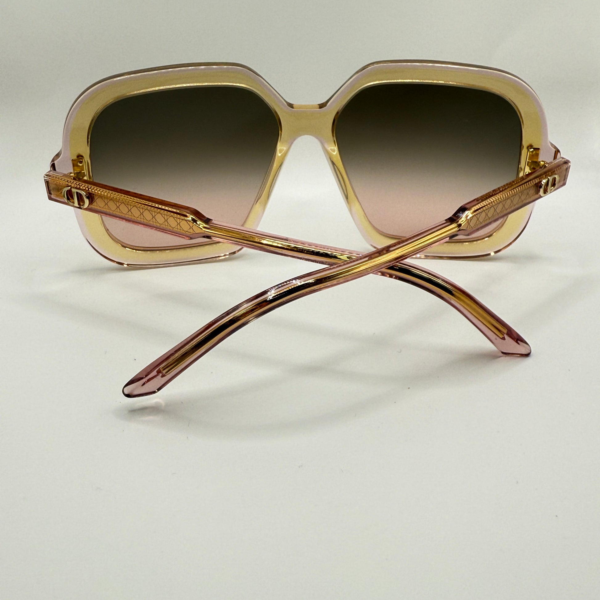 Sulle aste, il logo CD dorato firma con discrezione l’occhiale, mentre le lenti sfumate grigio-rosa aggiungono profondità e comfort visivo con protezione UV totale.