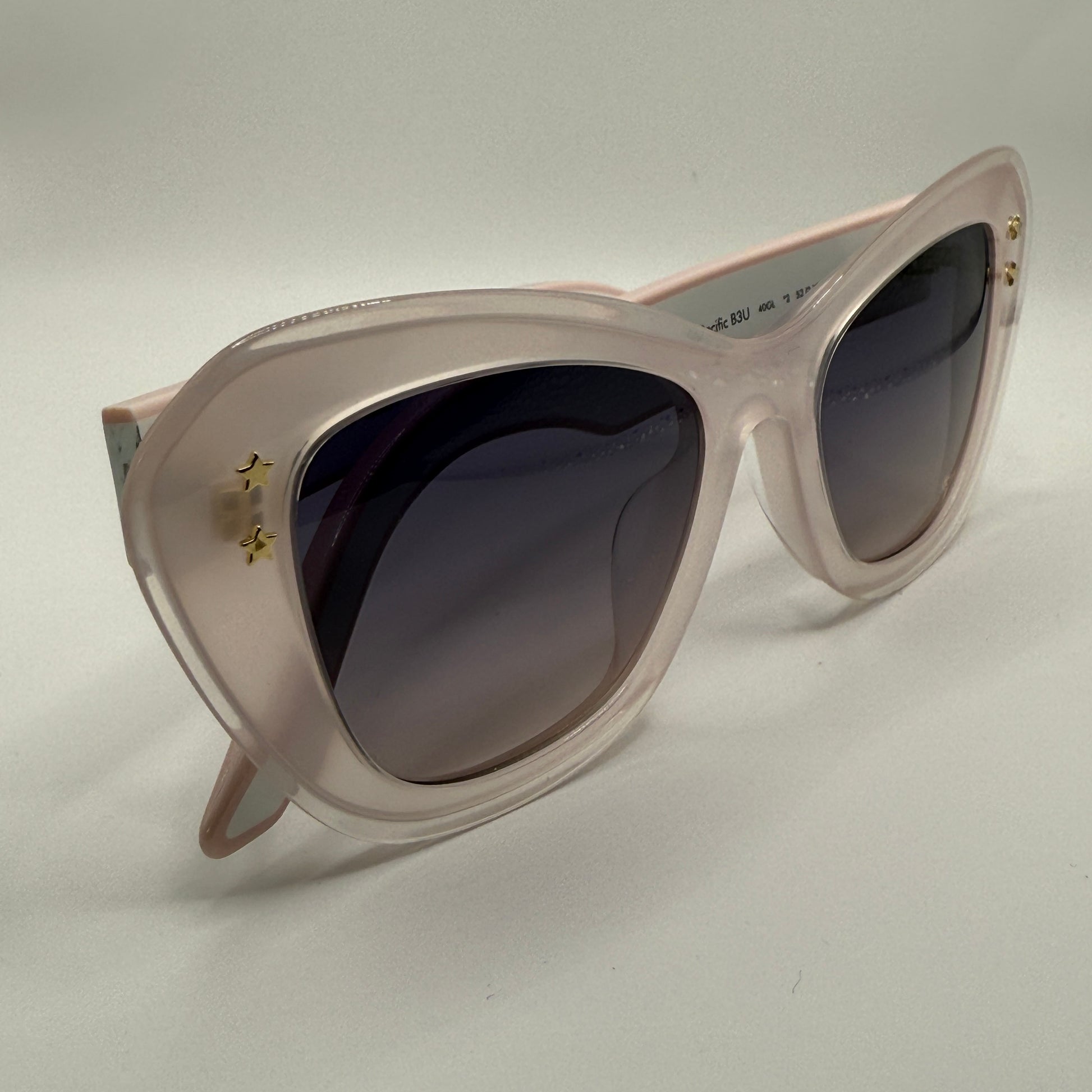 La montatura in acetato rosa cipria trasparente valorizza la forma a farfalla con una femminilità discreta, mentre le lenti sfumate grigio-violetto donano profondità e mistero allo sguardo.