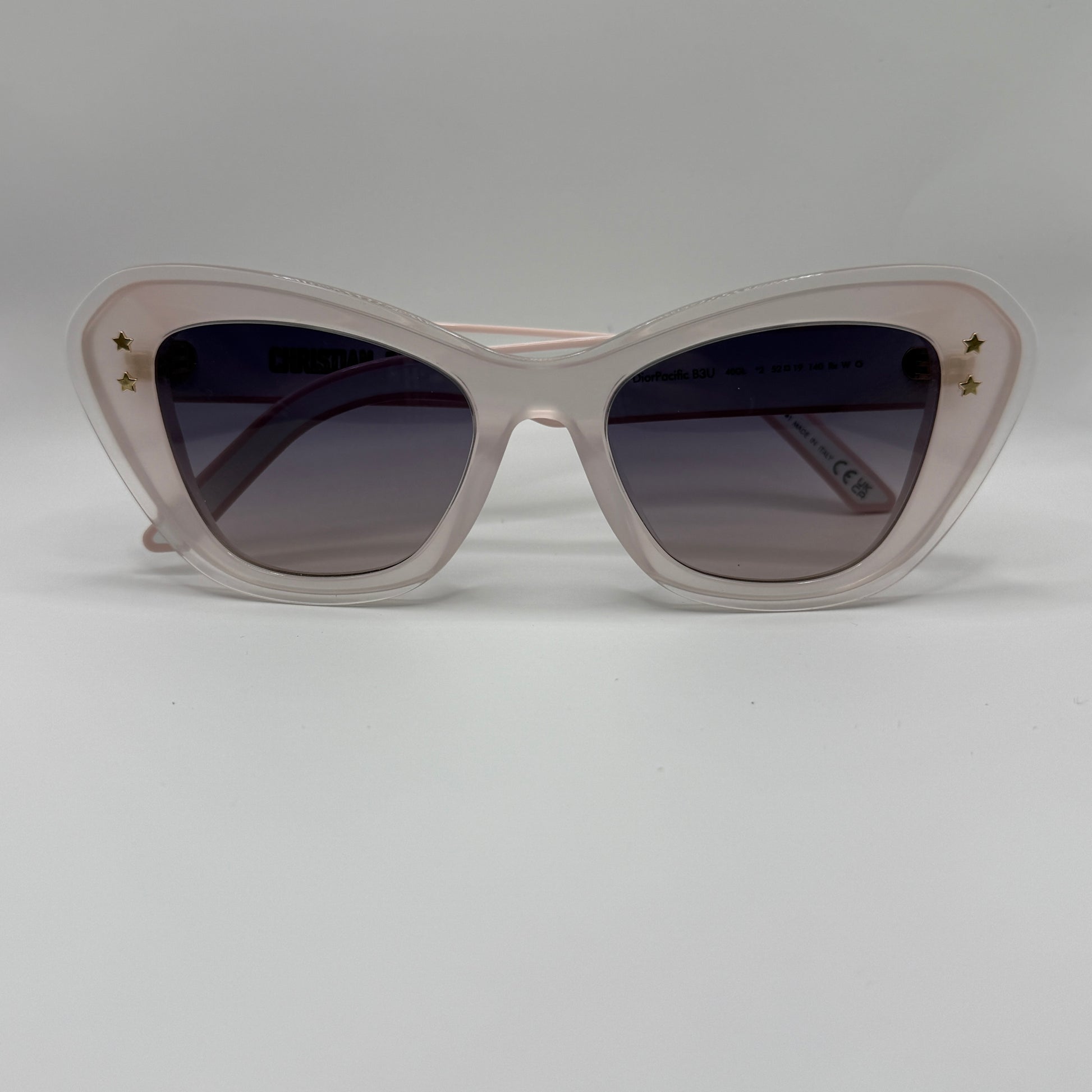 Le aste bianche con la firma “Christian Dior” rosa cipria si armonizzano perfettamente con la palette della montatura, impreziosite da piccoli dettagli dorati a stella sul frontale, che richiamano l’heritage couture della Maison.