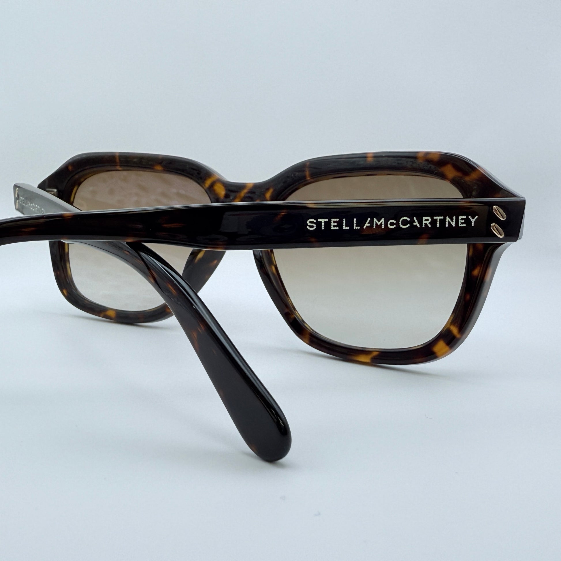 Occhiale da sole Stella McCartney 40003I, montatura squadrata con taglio geometrico deciso nella parte superiore. La struttura è in acetato (bio-acetato) con finitura elegante e presenta sulle aste micro-borchie / punzonature dorate che evidenziano il logo “Stella McCartney”, donando un dettaglio distintivo e raffinato. Le lenti sono marrone sfumato, con gradazione leggera e tonalità calda, ideale per chi cerca un look sofisticato ma versatile.